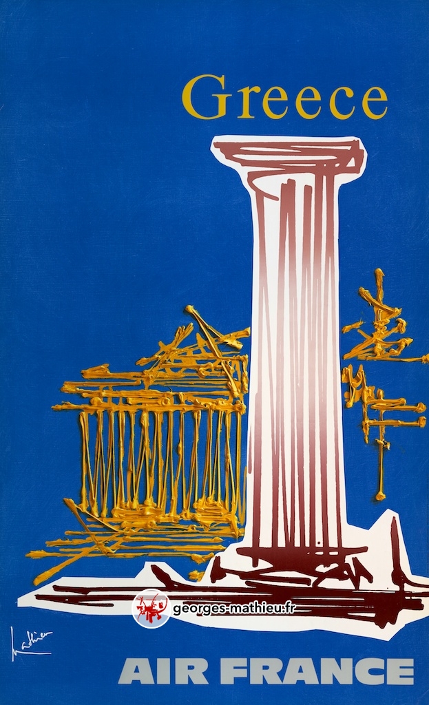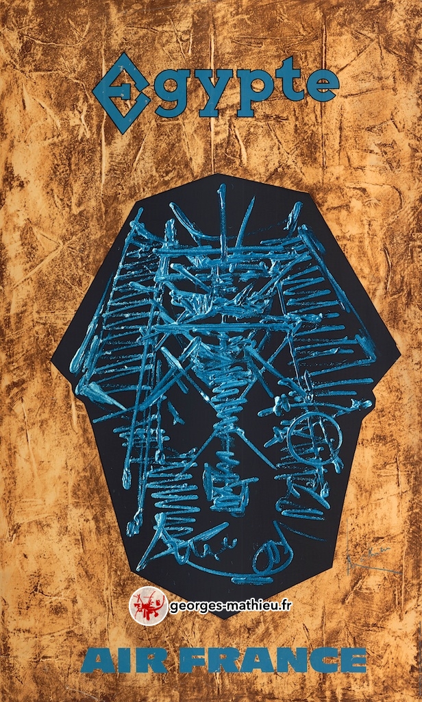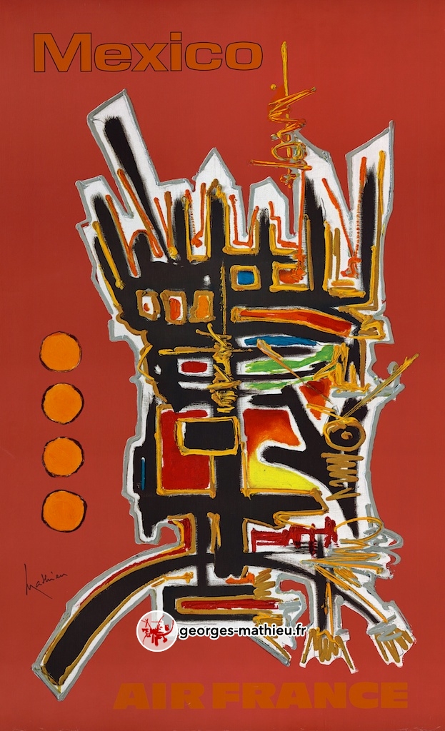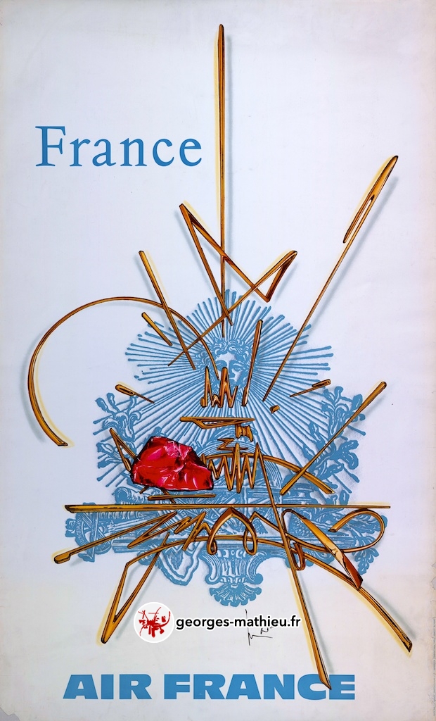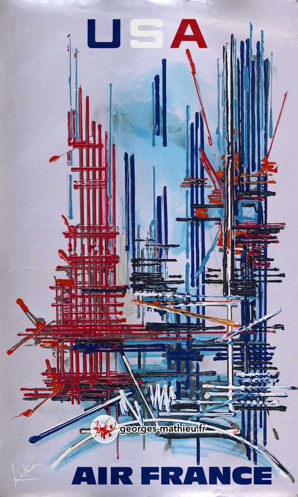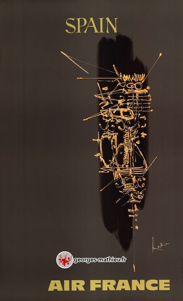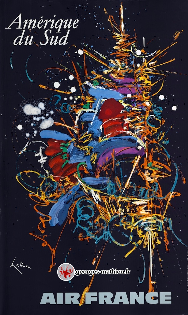 Commencée un an plus tôt, Mathieu acheva en 1967 la réalisation d’une série d’affiches pour Air France, dont l’initiative revient à Pierre Sautet, sous-directeur commercial d’Air France. Cette rencontre unique entre art et publicité aboutit à la présentation des affiches le 26 octobre 1967 au Musée d’Art Moderne de la Ville de Paris. Elles connurent un énorme succès : il y eut des dizaines d’expositions organisées en France puis dans le monde, et plus d’un million d’affiches vendues.