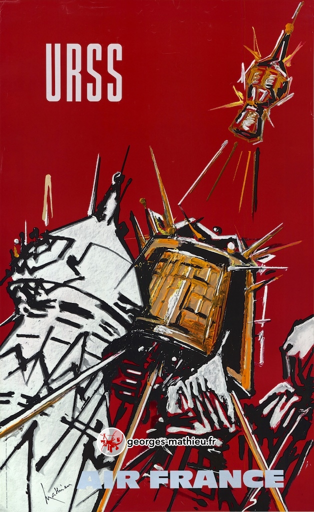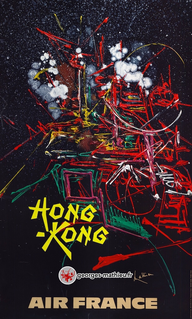 Cliquez sur une affiche puis sur le « i » de la barre du bas pour partager l’image, ou pour en découvrir la description qu’en donne Georges Mathieu — dont le verbe importe autant que la production picturale — dans le catalogue publié par Air France la même année. Les affiches sont ordonnées de la même façon que dans le catalogue, sachant que deux des seize affiches ne figurent pas dans le catalogue : Hong-Kong et l’URSS.